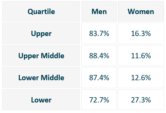 As in previous reporting periods, men continue to make up the majority across all quartiles, though the proportion of women in the Lower quartile has grown.